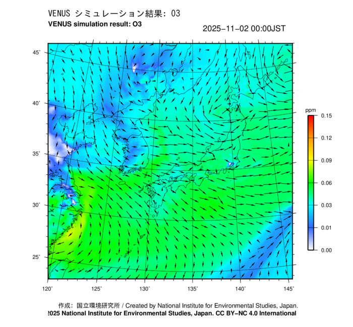 本サイトでは、国立環境研究所が開発・運用している「大気汚染予測システム(愛称:VENUS)」の予測結果を公開しています。ZIPファイルには、2025年11月2日の予測結果に基づいて作成したO...